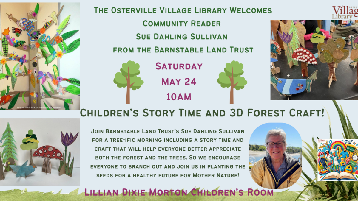 Join Barnstable Land Trust’s Sue Dahling Sullivan for a tree-ific morning including a story time and craft that will help everyone better appreciate both the forest and the trees. So we encourage everyone to branch out and join us in planting the seeds for a healthy future for Mother Nature. Let's make a 3D forest!